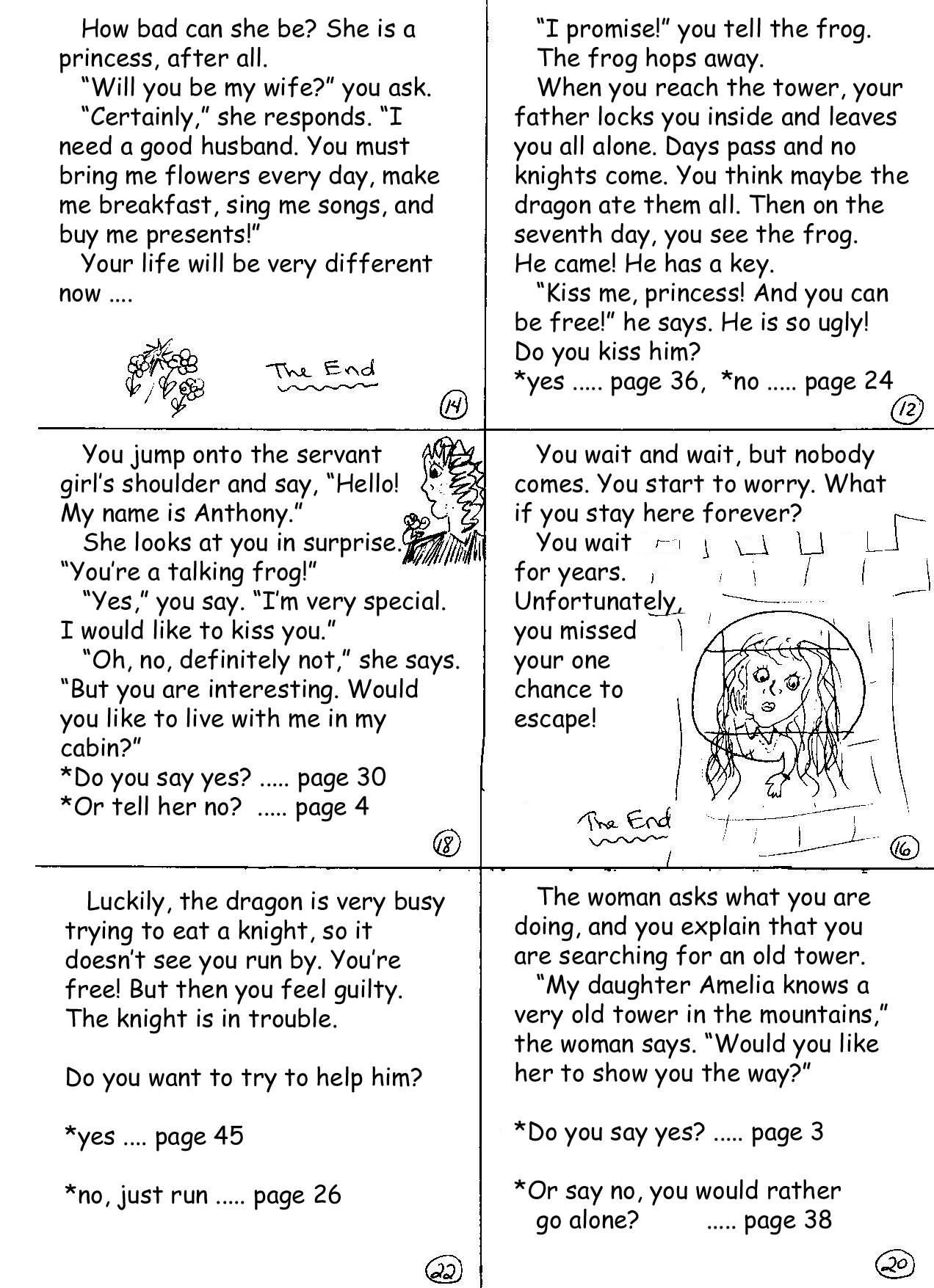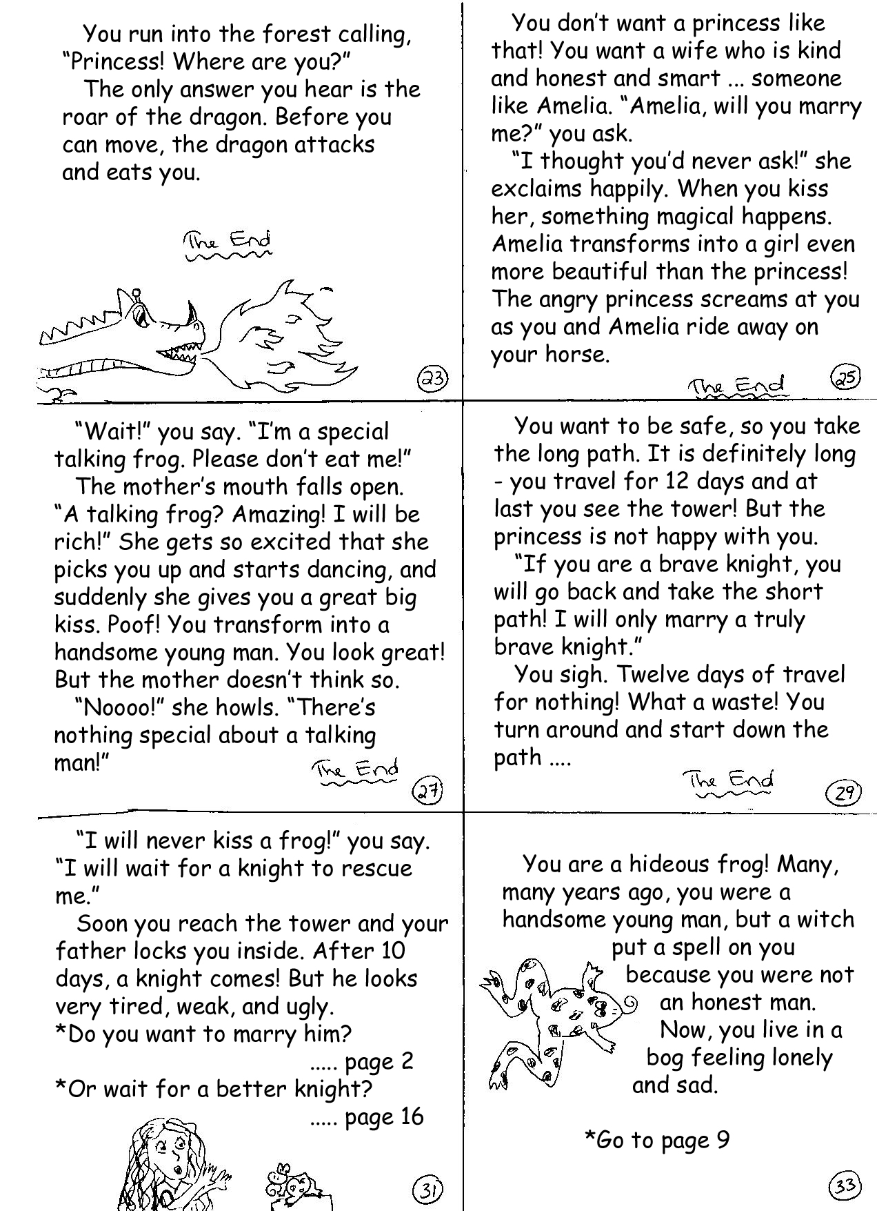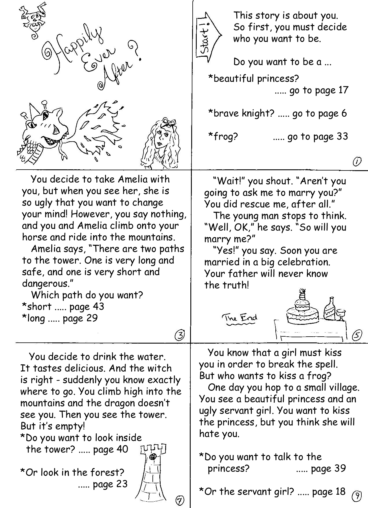 To the Student: This is not a normal story! In this story, YOU choose what happens. First, read the small page 1 where it says "start." You can see that you have to decide who you want to be - a princess, a knight, or a frog. The page you go to next depends on what you choose. (You will notice that the pages are numbered in a strange way. First the odd numbers are together, then even numbers, and so on.)