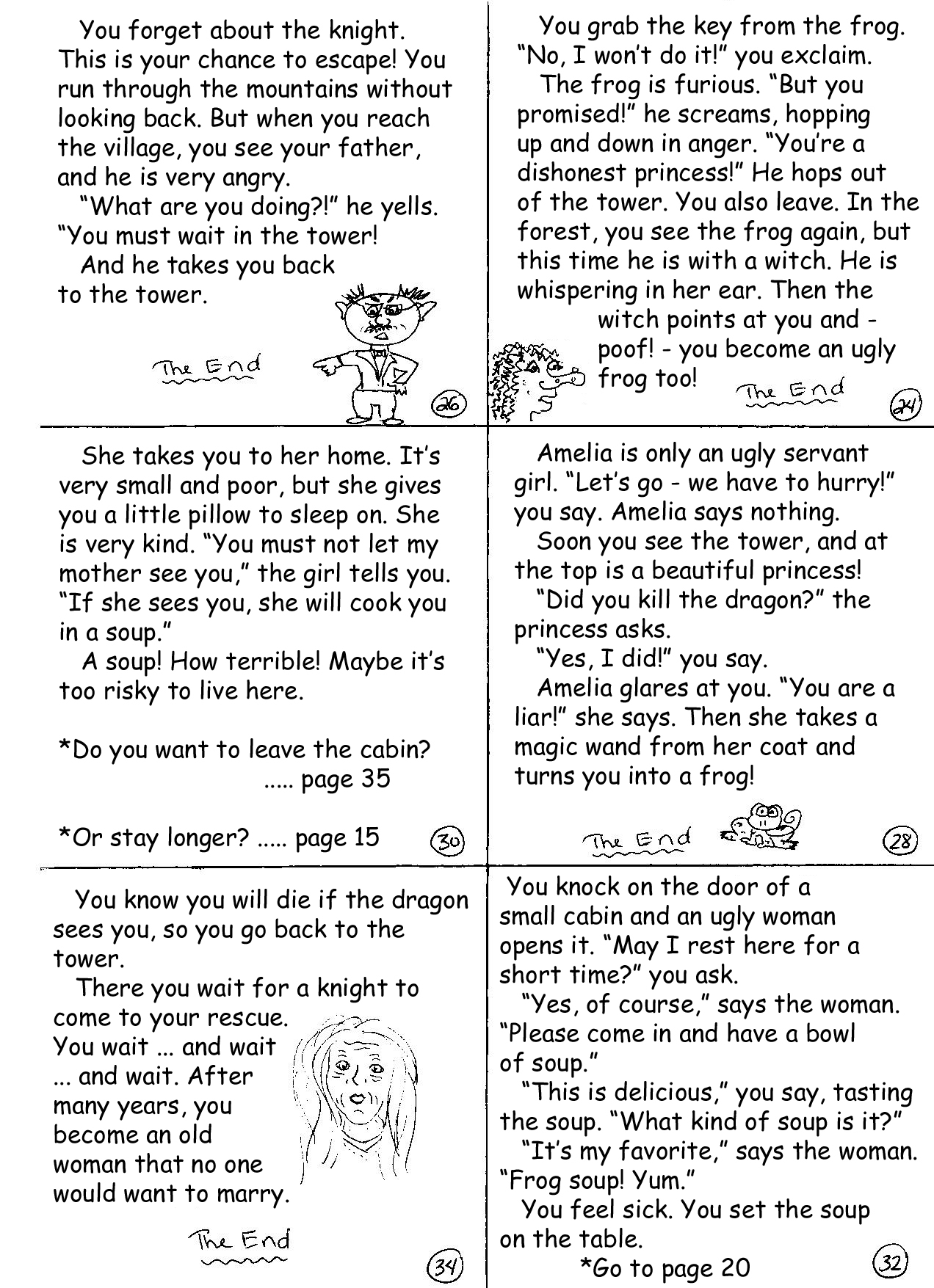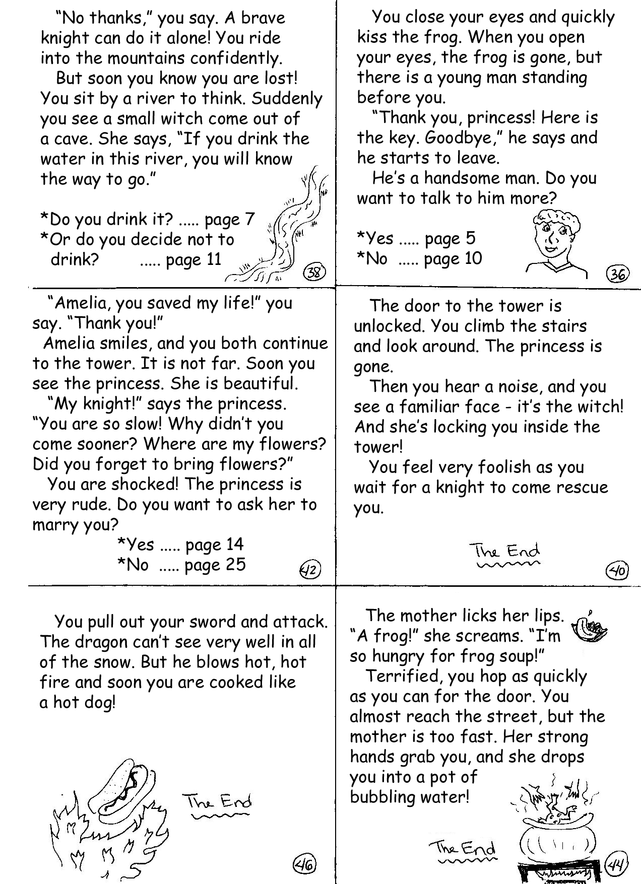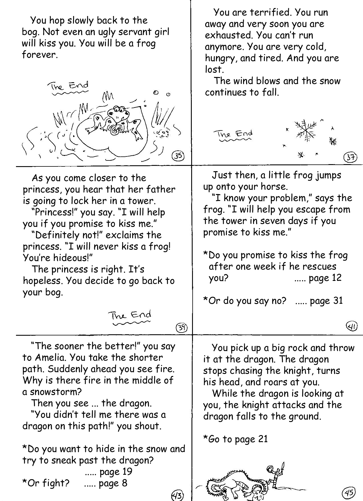 To the Student: This is not a normal story! In this story, YOU choose what happens. First, read the small page 1 where it says "start." You can see that you have to decide who you want to be - a princess, a knight, or a frog. The page you go to next depends on what you choose. (You will notice that the pages are numbered in a strange way. First the odd numbers are together, then even numbers, and so on.)